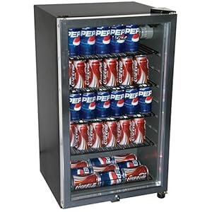 .And you can choose to buy a product and This spacious beverage center from Haier holds as much as 125 cans of soda or beer for the stockpiling needs. It's perfect for your dorm room, den or garage. Just stockpile the sleek black cabinet along with your favorite thirst-quenchers, and grab a can whenever you please. The glass door lets you look at the contents at a glance, and an automatic interior light illuminates once you open the door. It even accommodates tall bottles having a handy flip-shelf.