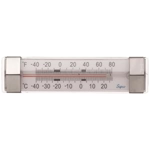 Designed for refrigerator and freezer applications. Provided with two integral stainless steel wire clips for simplicity of hanging on wire shelves. The horizontal design minimizes shelf storage obstruction. Reads both in Centigrade and Fahrenheit. Temperature range: -40 - 80 degree F. Application: refrigerators/freezers.